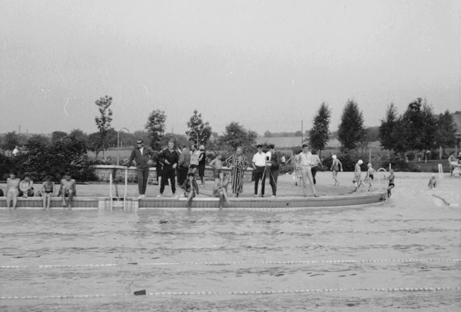 Seit Ende 2023 wird die denkmalgeschützte Anlage aus den späten 1950er-Jahren umfassend saniert. Neben der behutsamen Erneuerung von Hauptbecken, Sprungturm, Bademeisterhaus und Umkleiden entstehen ein Kinderbecken, eine Rutsche sowie drei moderne Technikgebäude. Während der historische Bestand mit seinem gelben Klinker erhalten und saniert wird, setzen die Neubauten mit hellen Fassaden und begrünten Dächern einen klaren, zeitgemäßen Akzent.