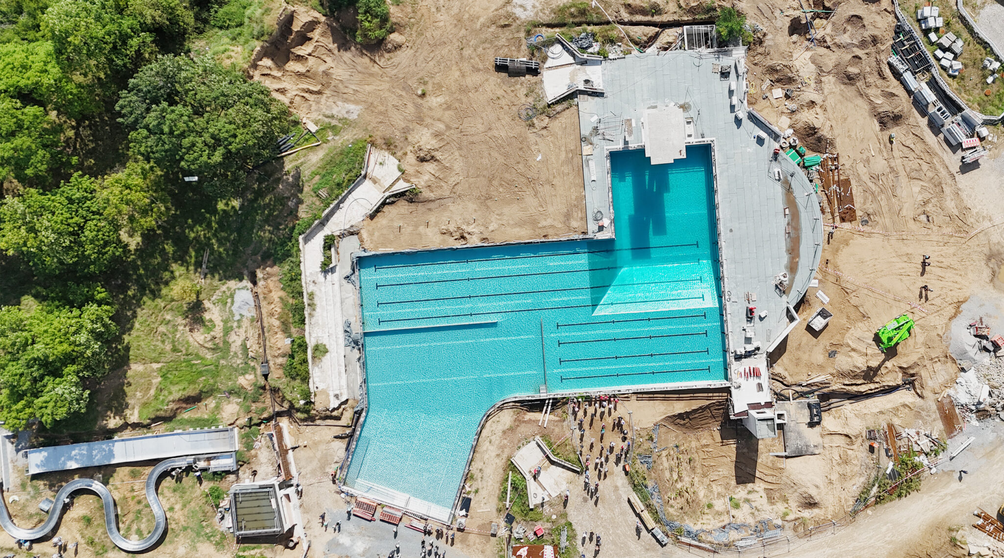 Der Bauablauf und die Arbeit am denkmalgeschützten Bestand halten einige Herausforderungen bereit. Dennoch liegen die Arbeiten gut im Zeitplan. Haupt- und Kinderschwimmbecken sind bereits fertiggestellt, während sich die neuen Baukörper derzeit im Ausbau befinden. Alle Anlagenteile werden nun Schritt für Schritt fertiggestellt und über Elemente wie den Beckenumgang in die umgebende Landschaft eingebunden. Darauf abgestimmt laufen die Natursteinarbeiten rund um die Durchschreitebecken und die Sanierungsarbeiten im denkmalgeschützten Bestand. Bis zur geplanten Eröffnung im kommenden Jahr werden schließlich auch die Außenbereiche rund um die Badegebäude fertiggestellt, sodass die Beachvolleyball- und Beachhandballfelder sowie die gesamten Anlagen in neuem Glanz erstrahlen.