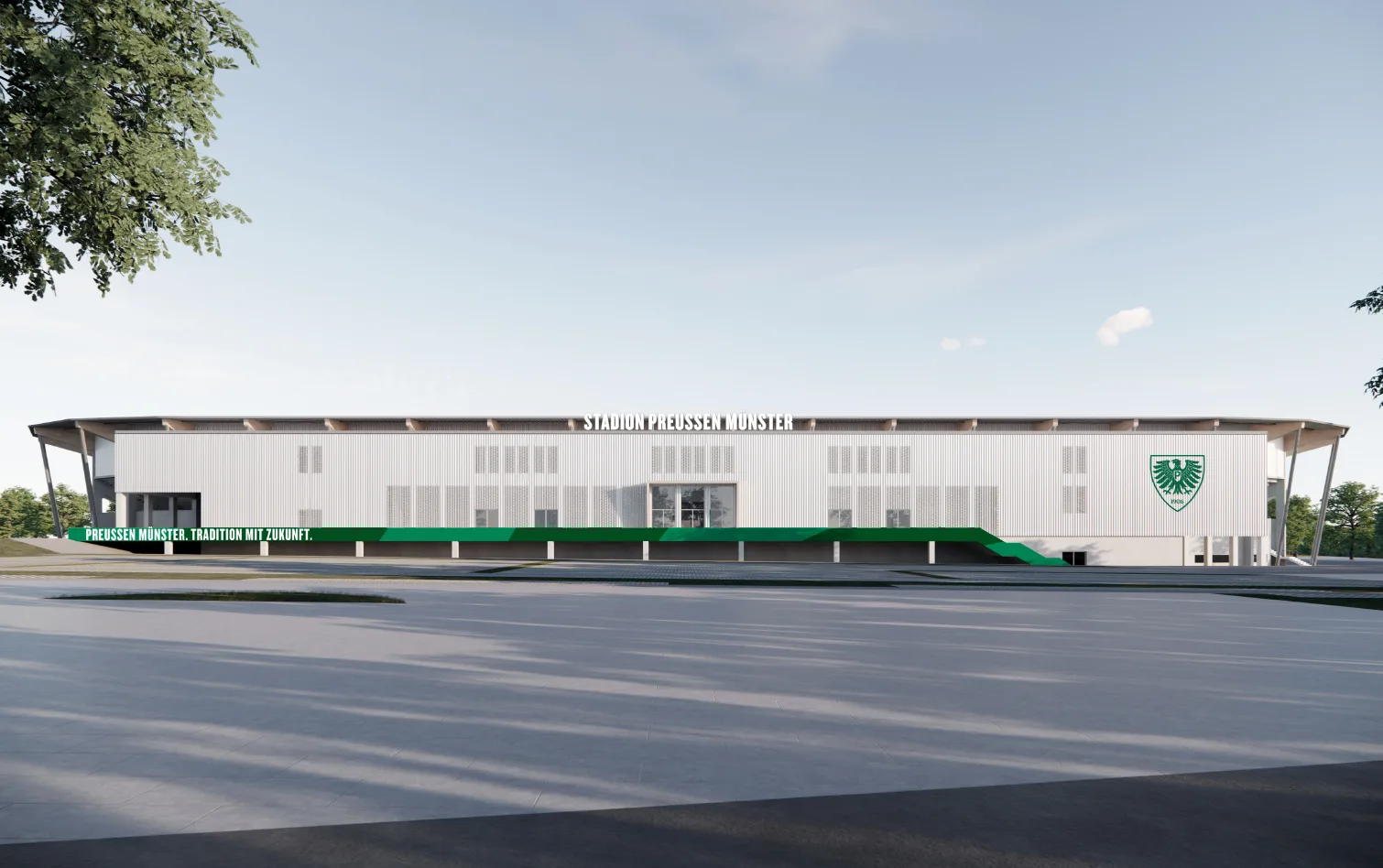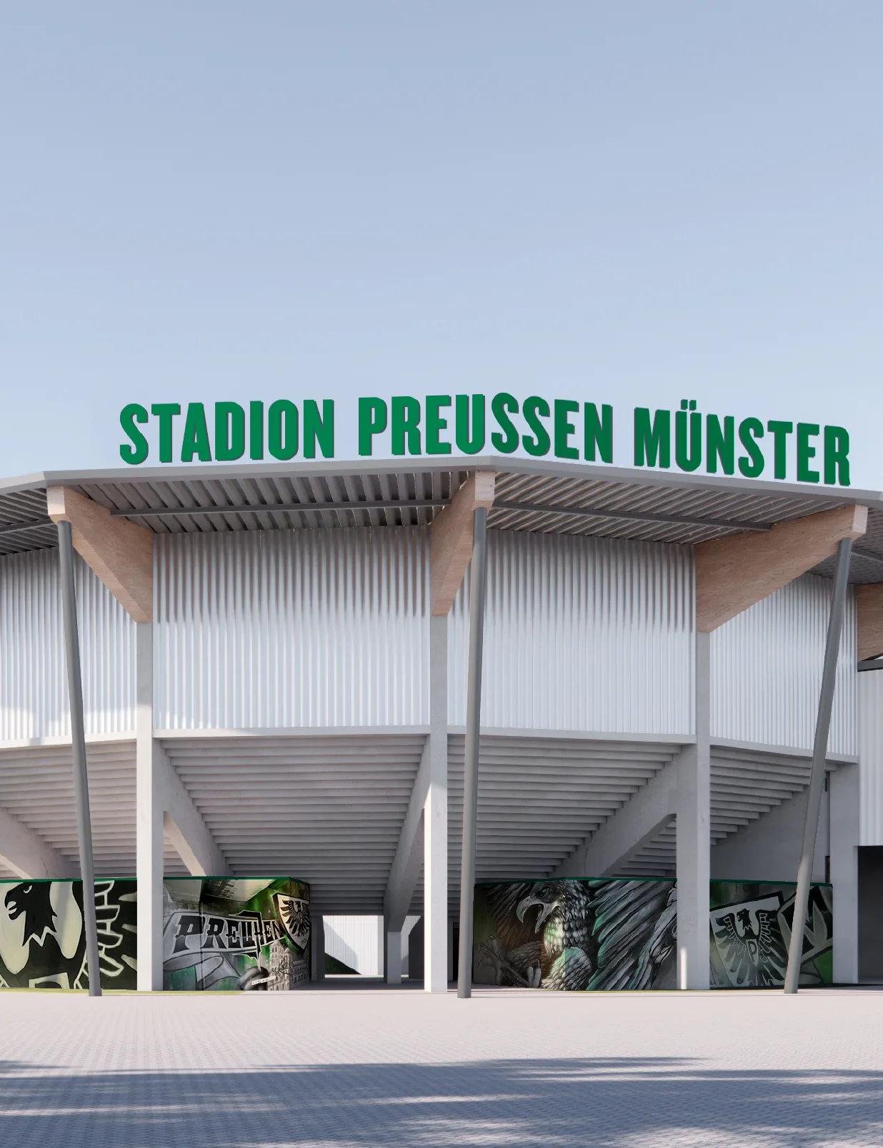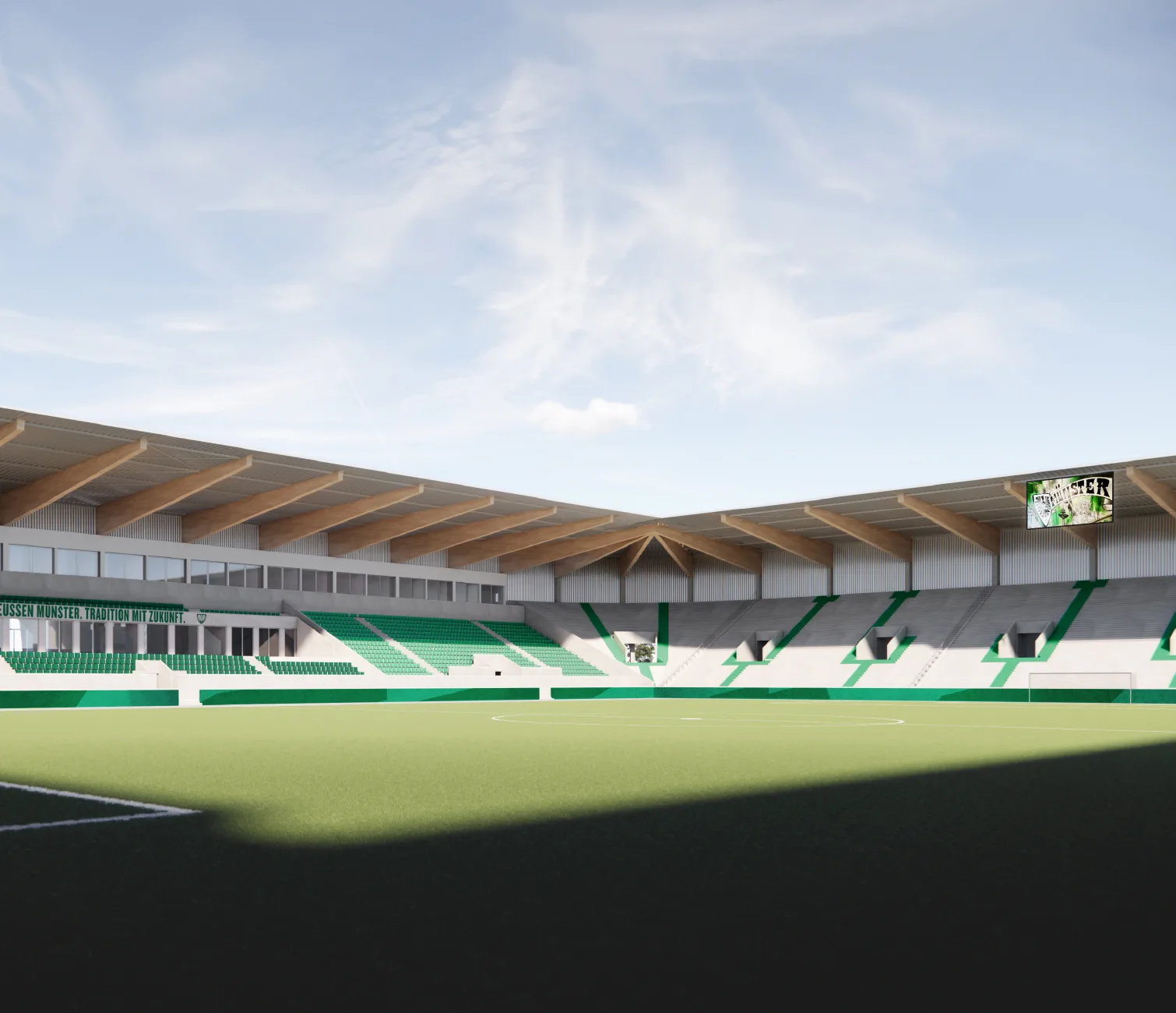 Das Stadion an der Hammer Straße in Münster wird modernisiert und zur zeitgemäßen Fußballarena weiterentwickelt. Im Rahmen eines Design-and-Build-Verfahrensist ein Konzept entstanden, das die bestehende Südtribüne integriert und mit drei ergänzenden Tribünen einen geschlossenen Arenacharakter schafft. Eine umlaufende Promenade verbindet alle Zuschauerbereiche. Die Nordtribüne bietet Raum für Business- und Hospitality-Bereiche, während die Osttribüne als reine Stehplatztribüne mit steiler Neigung ausgeführt ist. Im Südosten ergänzt eine sportorientierte Kindertagesstätte das Stadiongelände. Gestalterisch verbindet der Entwurf robuste Materialien wie Recyclingbeton mit Holzelementen und nimmt Bezug auf klassische Fußballarchitektur. Ein auskragendes Dachtragwerk aus Brettschichtholz, begrünte Dächer und ein Regenwasserkonzept mit Versickerungsmulden tragen zur ökologischen Qualität bei. Mit Platz für rund 19.000 Besucher:innen entsteht eine funktionale, zugängliche und stimmungsvolle Spielstätte für Verein, Fans und Stadt.