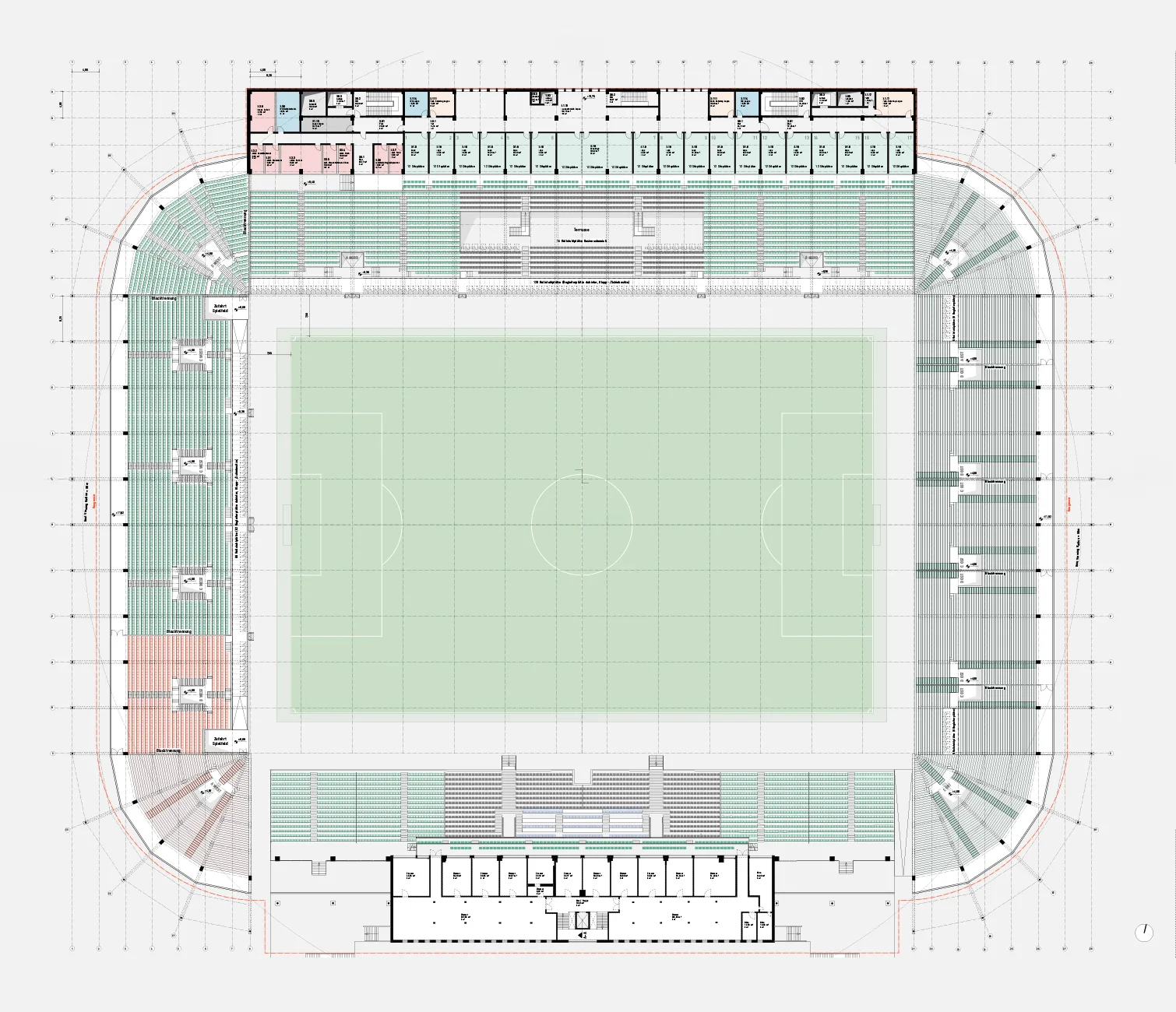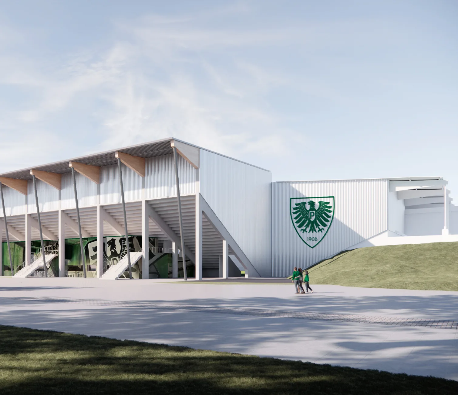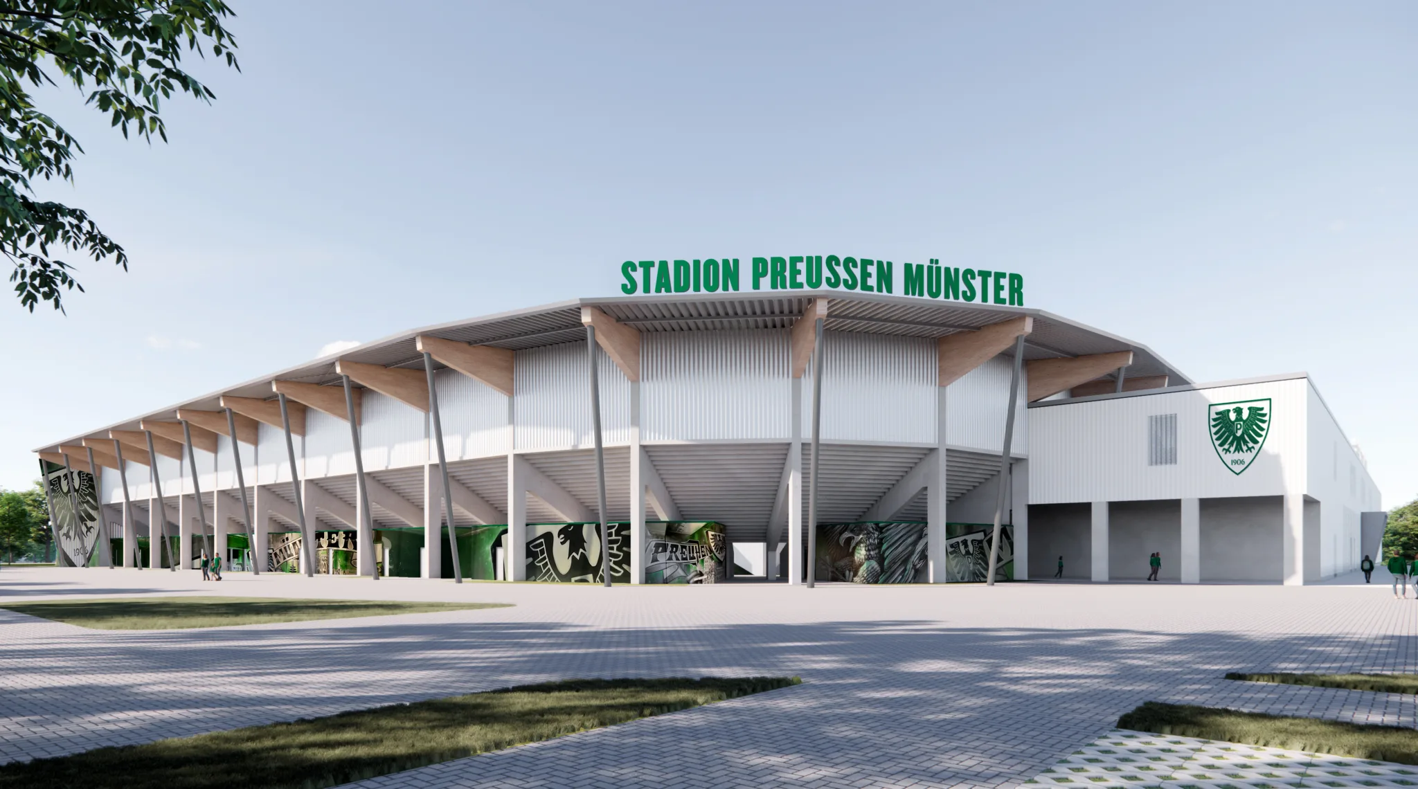 Das Stadion an der Hammer Straße in Münster wird modernisiert und zur zeitgemäßen Fußballarena weiterentwickelt. Im Rahmen eines Design-and-Build-Verfahrensist ein Konzept entstanden, das die bestehende Südtribüne integriert und mit drei ergänzenden Tribünen einen geschlossenen Arenacharakter schafft. Eine umlaufende Promenade verbindet alle Zuschauerbereiche. Die Nordtribüne bietet Raum für Business- und Hospitality-Bereiche, während die Osttribüne als reine Stehplatztribüne mit steiler Neigung ausgeführt ist. Im Südosten ergänzt eine sportorientierte Kindertagesstätte das Stadiongelände. Gestalterisch verbindet der Entwurf robuste Materialien wie Recyclingbeton mit Holzelementen und nimmt Bezug auf klassische Fußballarchitektur. Ein auskragendes Dachtragwerk aus Brettschichtholz, begrünte Dächer und ein Regenwasserkonzept mit Versickerungsmulden tragen zur ökologischen Qualität bei. Mit Platz für rund 19.000 Besucher:innen entsteht eine funktionale, zugängliche und stimmungsvolle Spielstätte für Verein, Fans und Stadt.