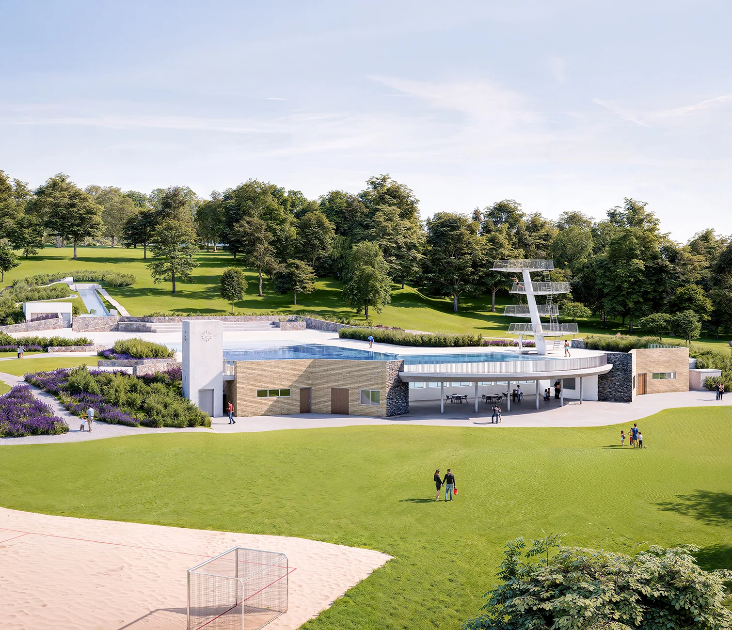 Three new buildings to house the mechanical equipment for the pools are intentionally designed to differentiate themselves from the historic structures. While the existing structures will retain their yellow brick appearance, the new buildings will be cast in concrete with green roofs. The modernizations will allow the facility to meet the latest technical and sustainability standards while preserving the historical character of the pool and surrounding landscape.