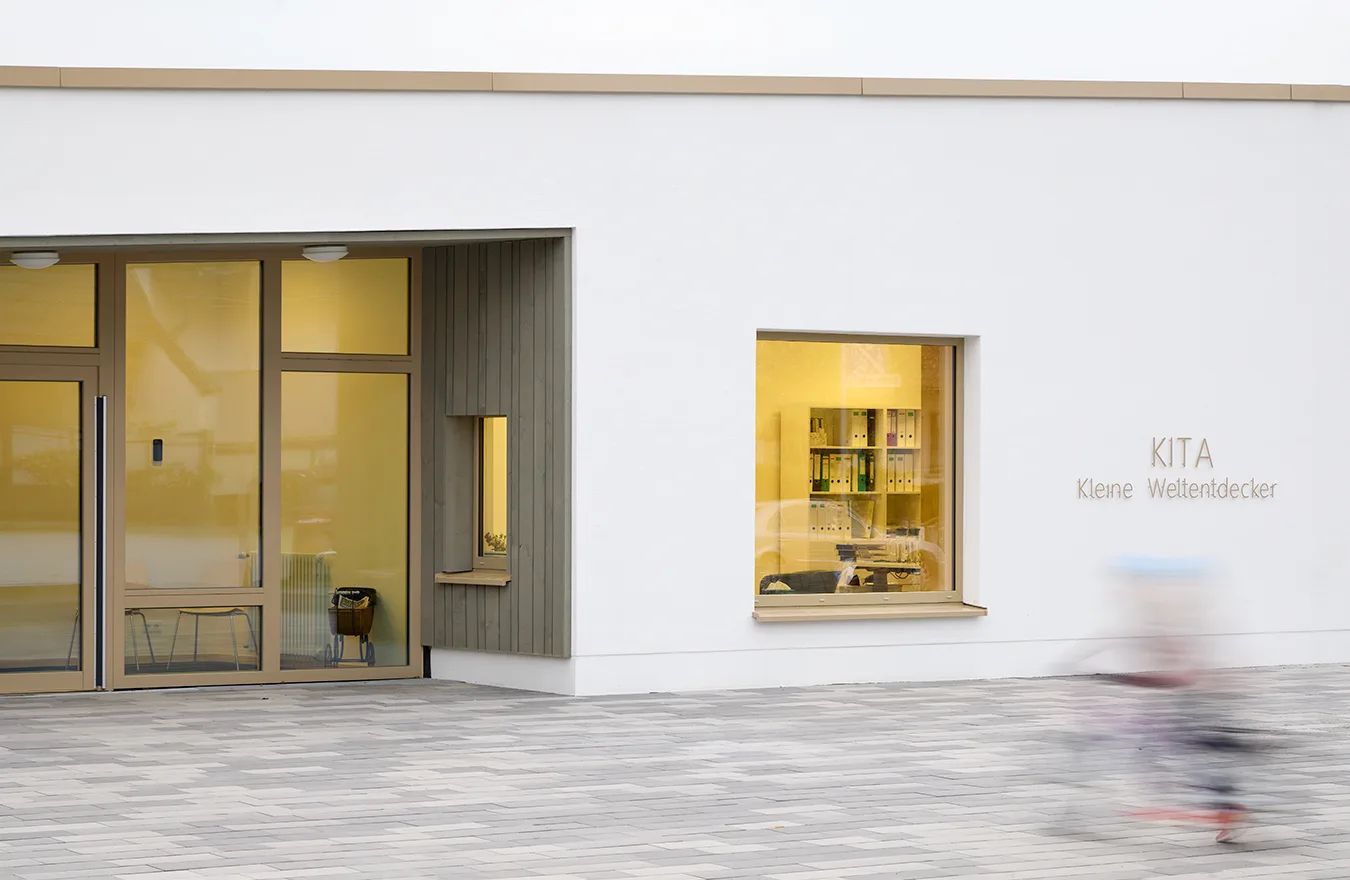 This two-story daycare facility in Riedberg accommodates five groups of children in a sculptural building shaped by daylight studies and site context. The floor plan organizes classrooms for under-threes on the ground floor and over-threes on the upper level, both connected by a generous internal courtyard. A wraparound escape balcony provides outdoor access and shaded play space, enhancing both safety and community interaction. Designed to Passive House standards, the project features extensive glazing, external shading, and green roof elements. The freeform volume reflects both functional zoning and optimal solar orientation. Kitchen and service spaces are discreetly tucked into the northwest corner with separate access.