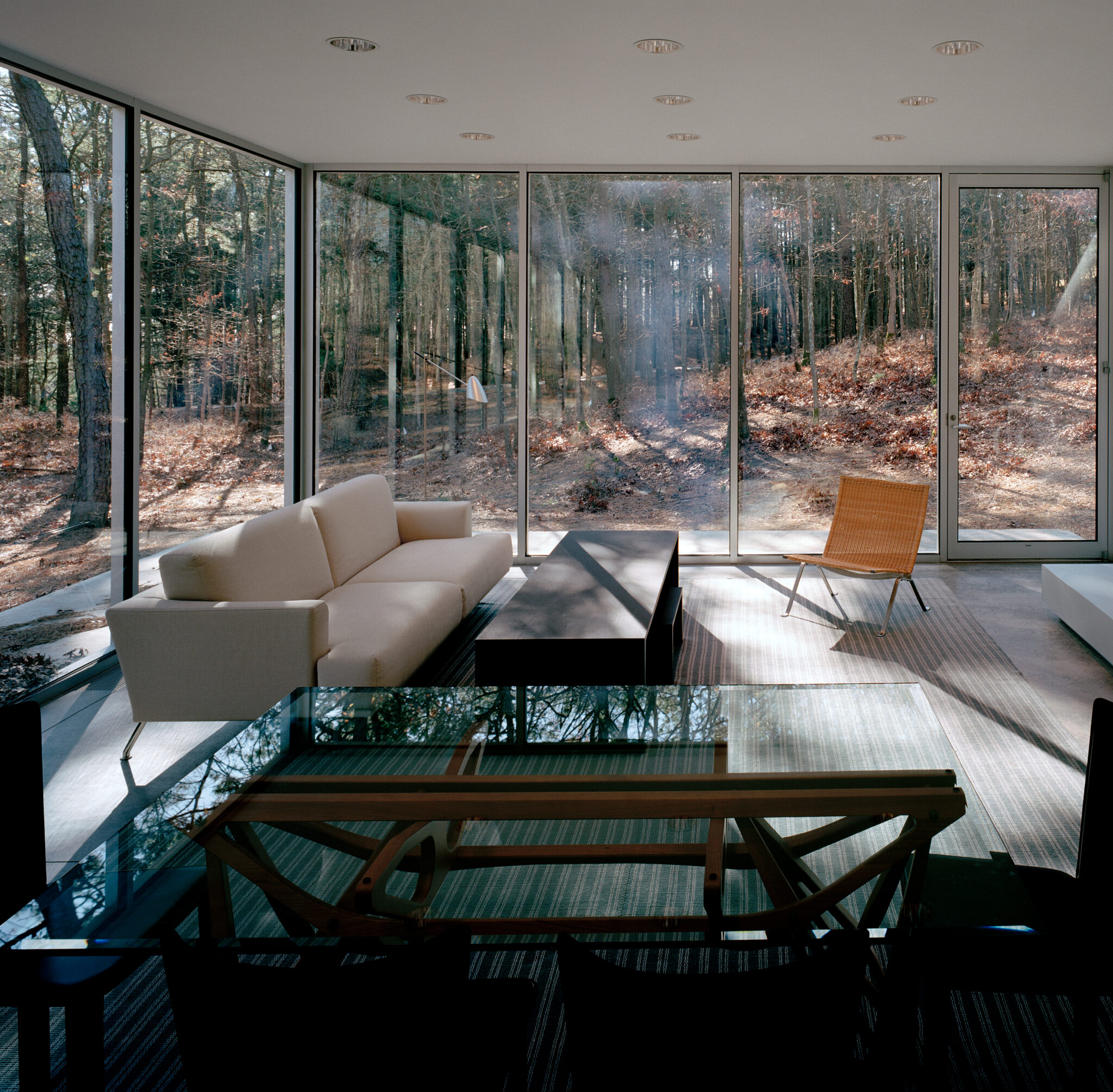 One of several structures on a 15-acre wooded estate, the Water Mill Guesthouse echoes the design logic of the nearby main house: open to light, screened by trees. Glass walls establish visual transparency and spatial lightness, while the surrounding landscape offers privacy and shade. Like the main residence, the Guesthouse is designed to maximize views and natural ventilation while maintaining a low environmental impact. Its material palette creates continuity across the compound without direct repetition. The structure provides comfortable accommodations for visitors while reinforcing the relationship with nature that reads throughout the overall retreat.